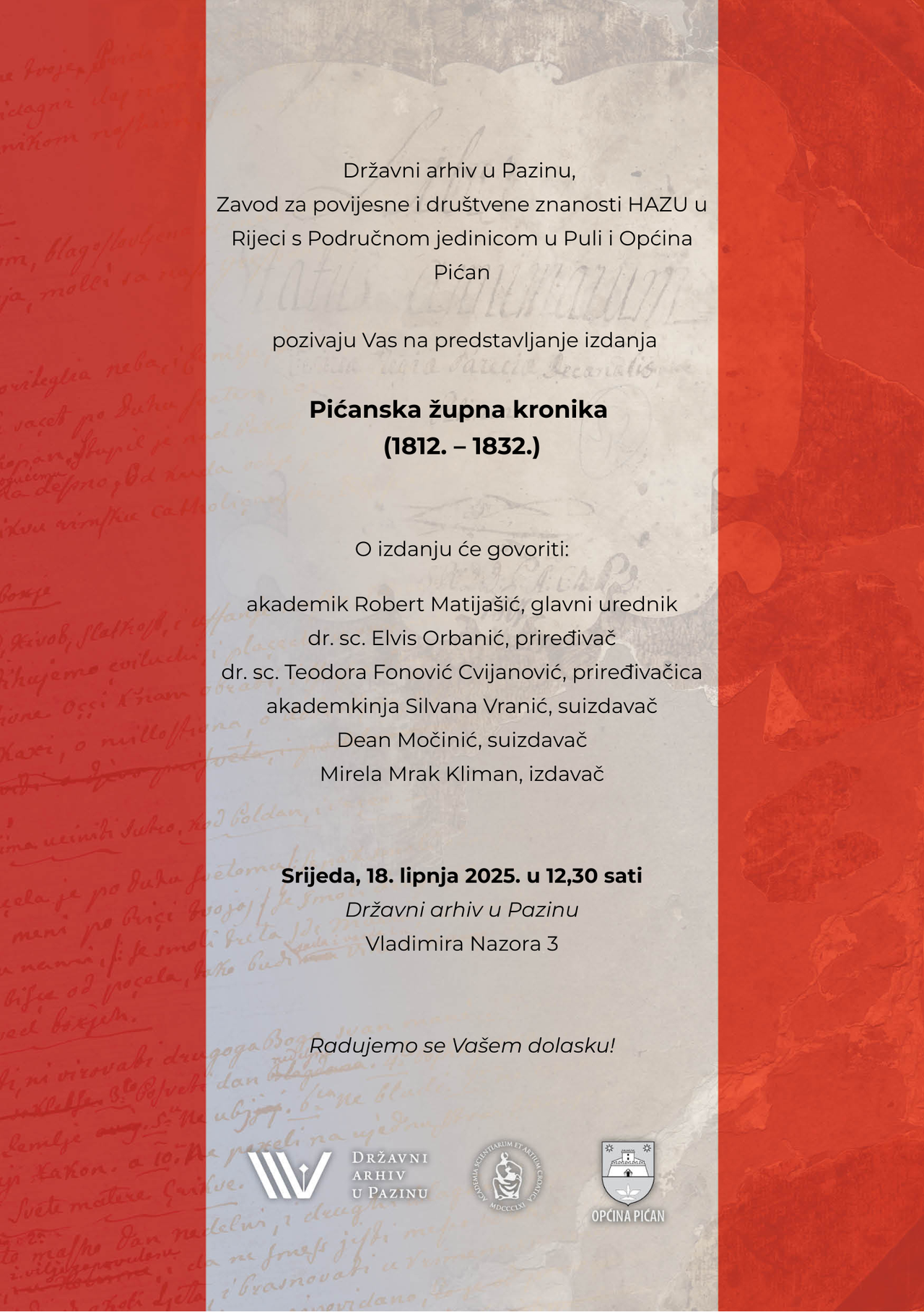 Državni arhiv u Pazinu, sa suizdavačima Hrvatskom akademijom znanosti i umjetnosti (Zavod za povijesne i društvene znanosti HAZU u Rijeci s Područnom jedinicom u Puli) i Općinom Pićan, objavio je knjigu „Pićanska župna kronika (1812.-1832.) s dodatkom na hrvatskome jeziku (Pazin 2025), koju su autorski priredili dr. h. c. mr. sc. Jakov Jelinčić, dr. sc. Elvis Orbanić i izv. prof. dr. sc. Teodora Fonović Cvijanović. Recenzenti su bili akademik Stjepan Ćosić, dr. sc. Damir Karbić (Hazu), prof. dr. sc. Lina Pliško (Pula) i prof. dr. sc. Lejla Nakaš (Sarajevo). Objava je to rukopisa pićanskog župnika i dekana Ivana Antuna Težaka (1776. – 1837.), koji je na talijanskome jeziku bilježio zbivanja u župi važna za svakodnevni život i u kontekstu opće povijesti, u vrijeme od kratkotrajne francuske vlasti (Ilirske pokrajine) do početka austrijske uprave, a u dodatku na kraju knjige Stanja duša zapisao je na hrvatskome jeziku molitve, zapovjedi i upute o kršćanskom životu.